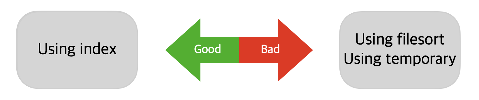 using filesort | 이미 정렬된 인덱스를 사용하지 못할 경우, 추가적인 데이터 정렬을 위해 메모리 혹은 디스크에서 정렬하는 상황임. 속도개선을 위해서는 인덱스 추가 대상이됨. |