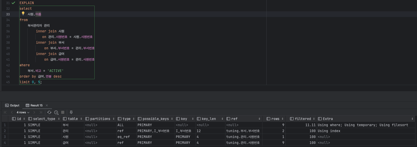 그래서 이를 보완하기 위해 Explain 명령어로 옵티마이저가 산출한 실행 계획(Explain)을 사용자가 확인할 수 있습니다.