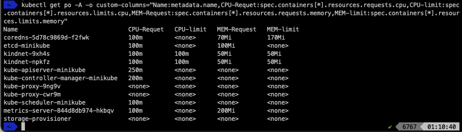 $ kubectl get po -A -o custom-columns="Name:metadata.name,CPU-Requet:spec.containers[*].resources.requests.cpu,CPU-limit:spec.containers[*].resources.limits.cpu,MEM-Request:spec.containers[*].resources.requests.memory,MEM-limit:spec.containers[*].resources.limits.memory"