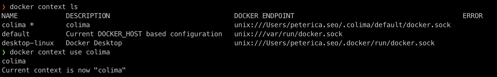 colima * colima unix:///Users/peterica.seo/.colima/default/docker.sock