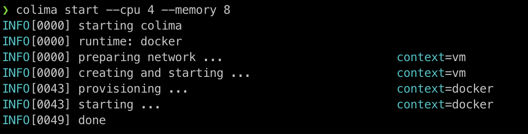$ colima start --cpu 4 --memory 8