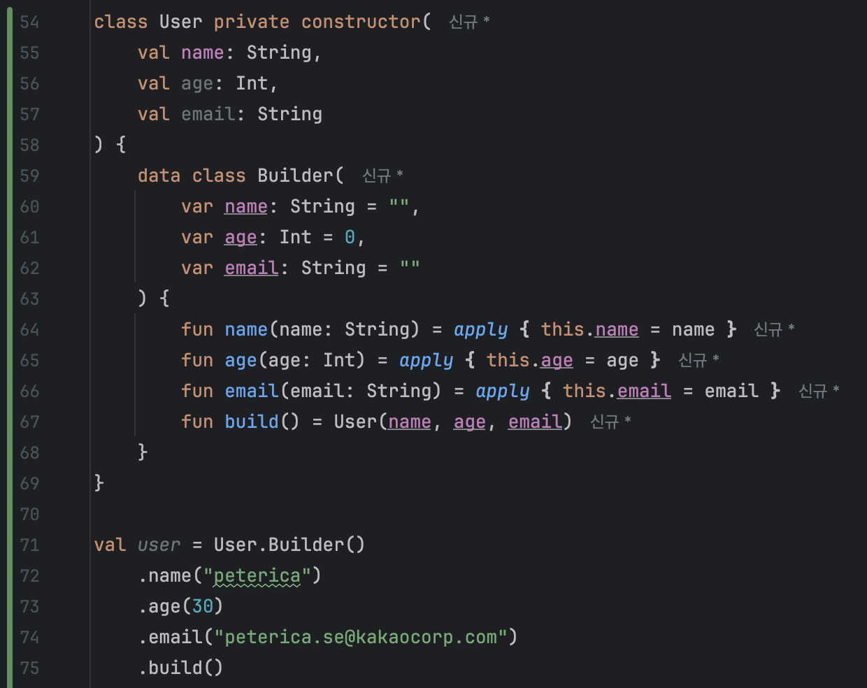 ㅇ Kotlin은 기본적으로 Builder 패턴을 사용하지 않아도 되는 언어적 특징을 가지고 있다.