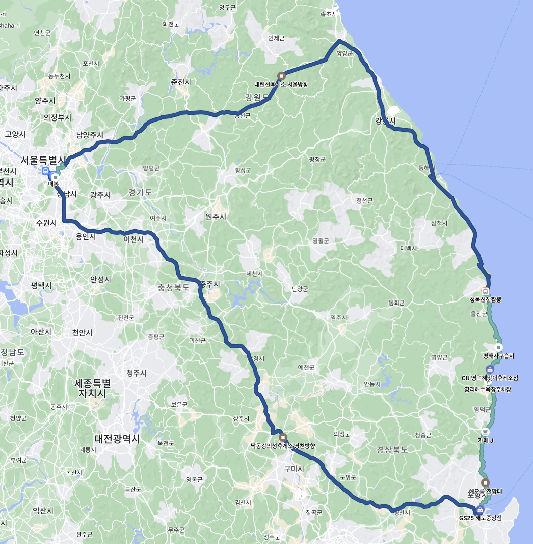 ㅇ 24일 0시 정각에 집을 떠나서 고속버스터미널 - 포항 - 울진 - 동서울터미널을 거쳐 19:33 동안 당일 라이딩을 마쳤습니다.