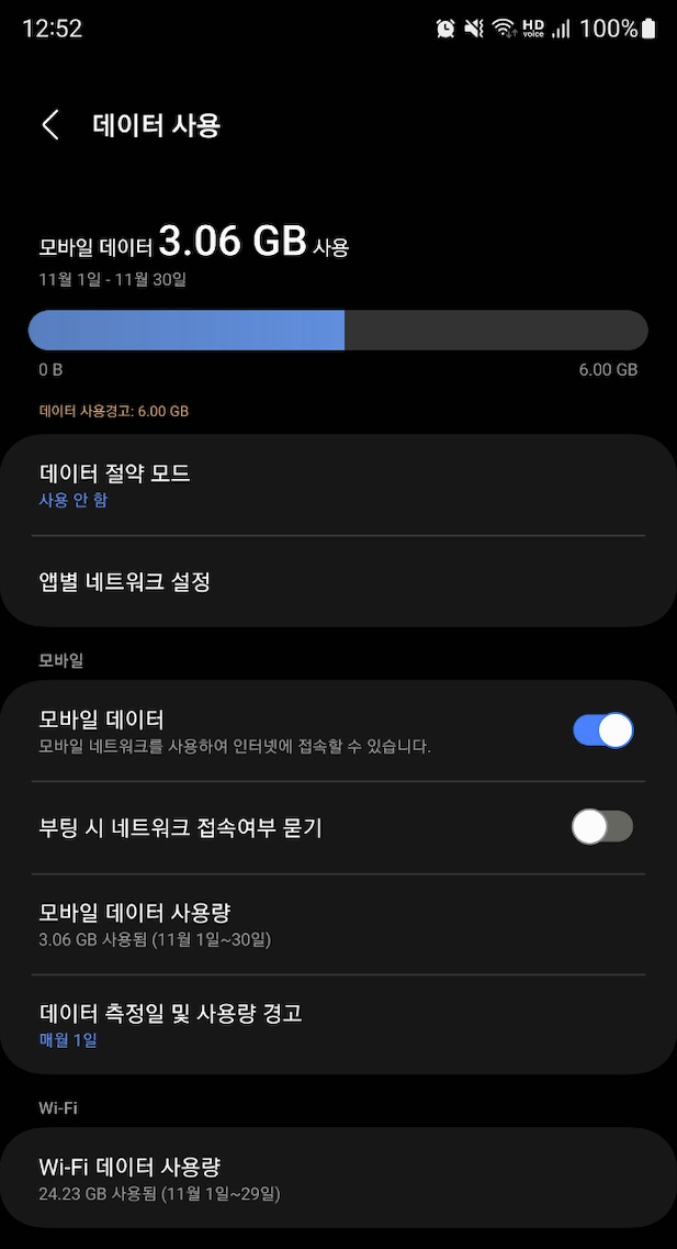 위는 안드로이드폰의 모바일 데이터 사용량 화면인데요.