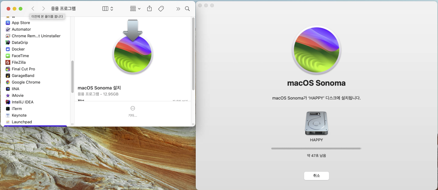 ㅇ 응용프로그램에서 macOS Sonoma 설치을 실행하였다.
