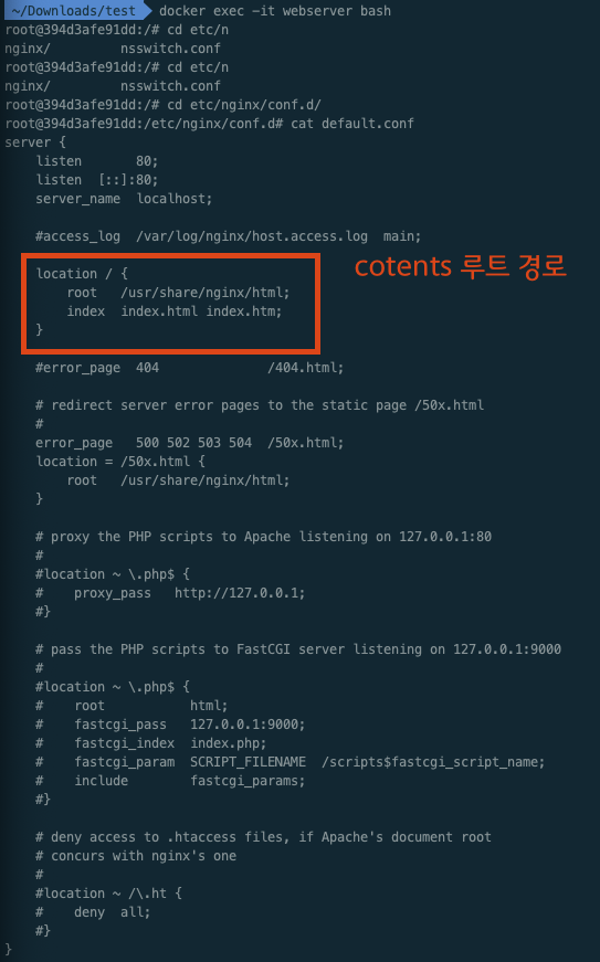 ㅇ 정확한 경로를 알기 위해 nginx 컨테이너로 들어가 default.conf을 직접 확인하였습니다.
