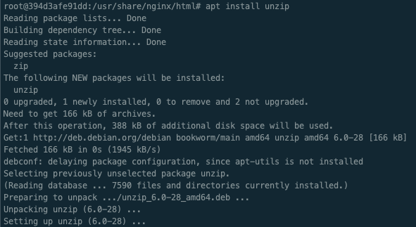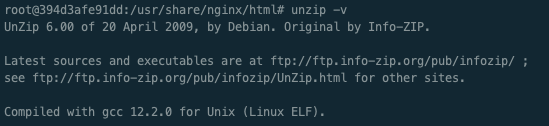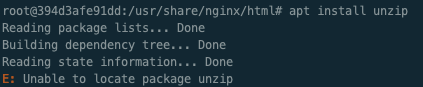 ㅇ nginx 컨테이너에는 zip이 설치되어 있지 않습니다.