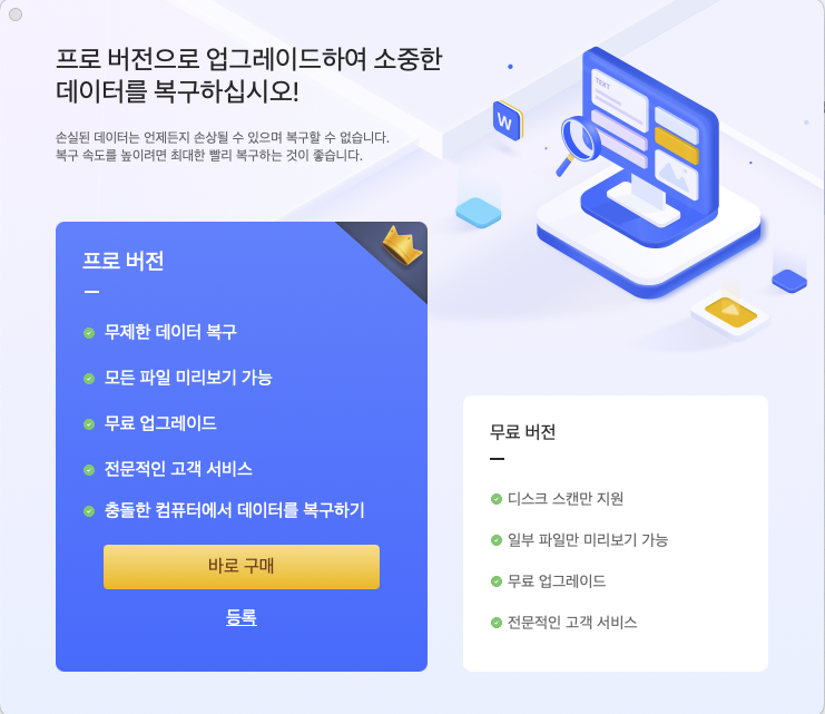 ㅇ 실질적인 복구를 위해서 프로버전으로 업그레이드가 필요합니다.