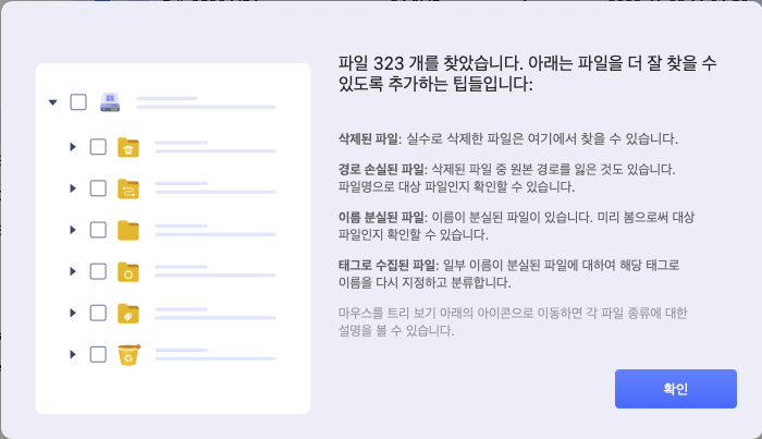 ㅇ 손실된 파일의 상황에 따라 삭제된 파일, 경로 손실된 파일, 이름 분실된 파일, 태그로 수집된 파일로 분류됩니다.