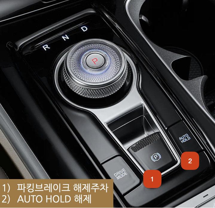 1. 시동이 켜져 있을 때, AutoHold와 전자식 파킹브레이크 해제하십시오.
