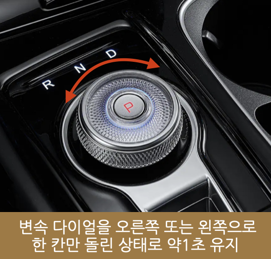 이 때에 브레이크 페달을 밝고 변속 다이얼을 오른쪽 또는 왼쪽으로 한 칸만 돌린 상태로 약1초 이상을 유지합니다.