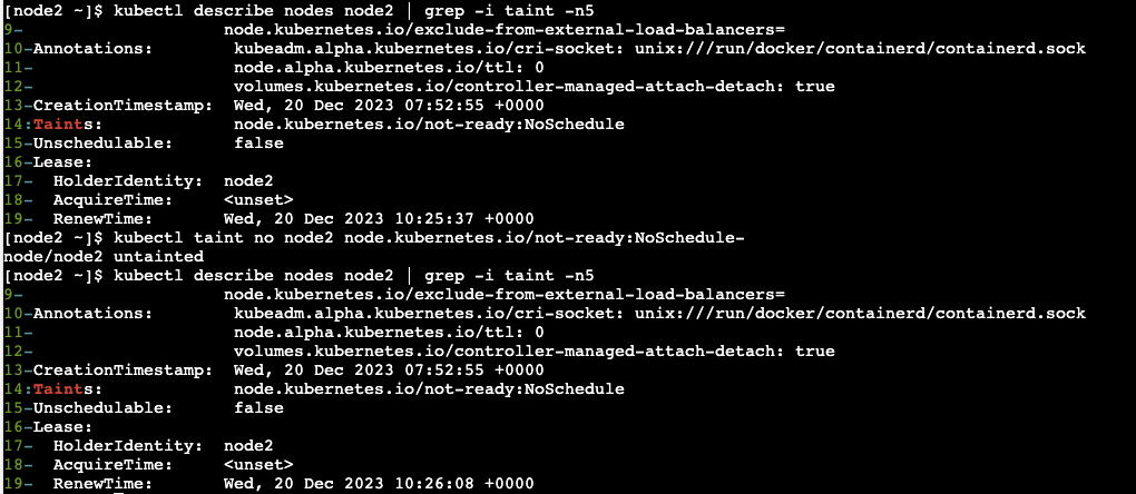 $ kubectl taint no node2 node.kubernetes.io/not-ready:NoSchedule-
