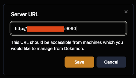 이 버튼을 클릭하고 Dokemon Server의 URL을 설정하세요. URL에 서버의 IP 주소, 호스트를 사용하십시오. 이 URL은 관리하려는 노드에서 액세스할 수 있는 EndPoint이어야 합니다.