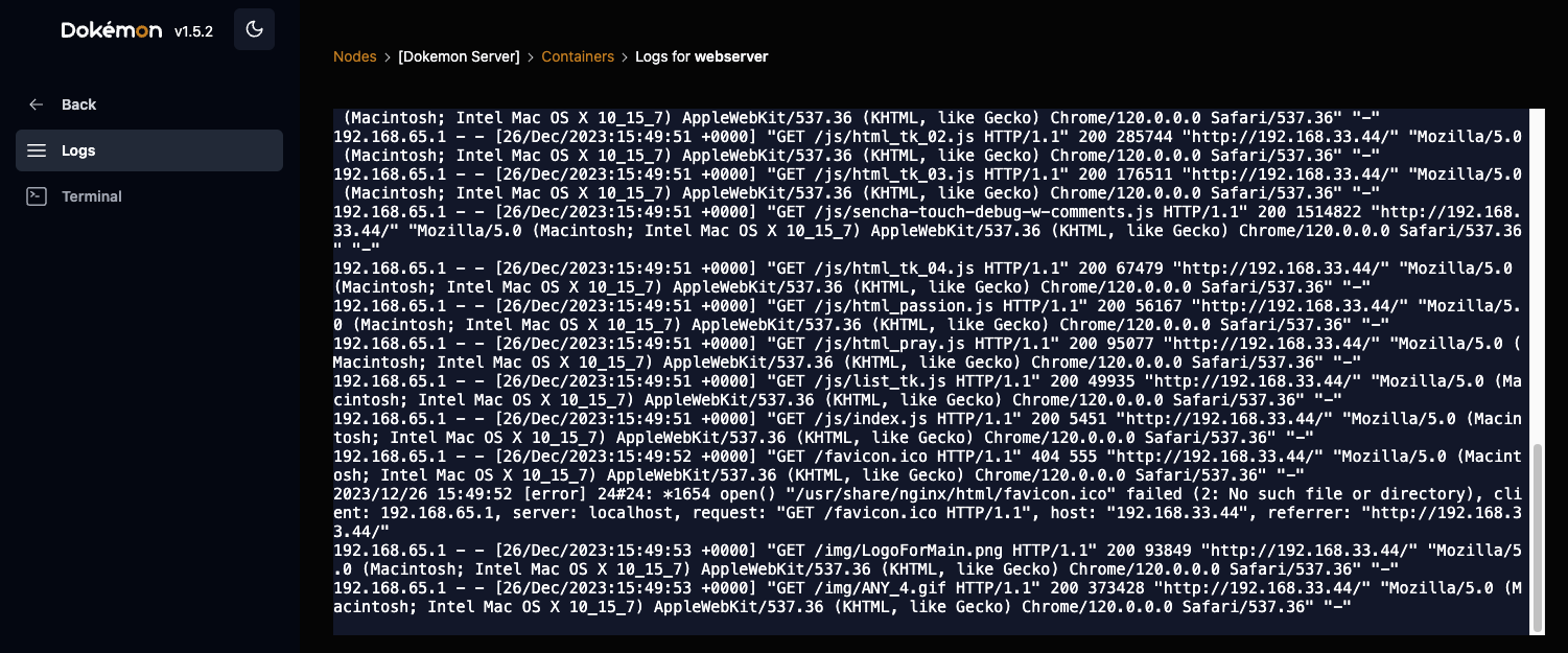 ㅇ 컨테이너 하나를 선택하면 Log를 확인 및 터미널 접속이 가능합니다.