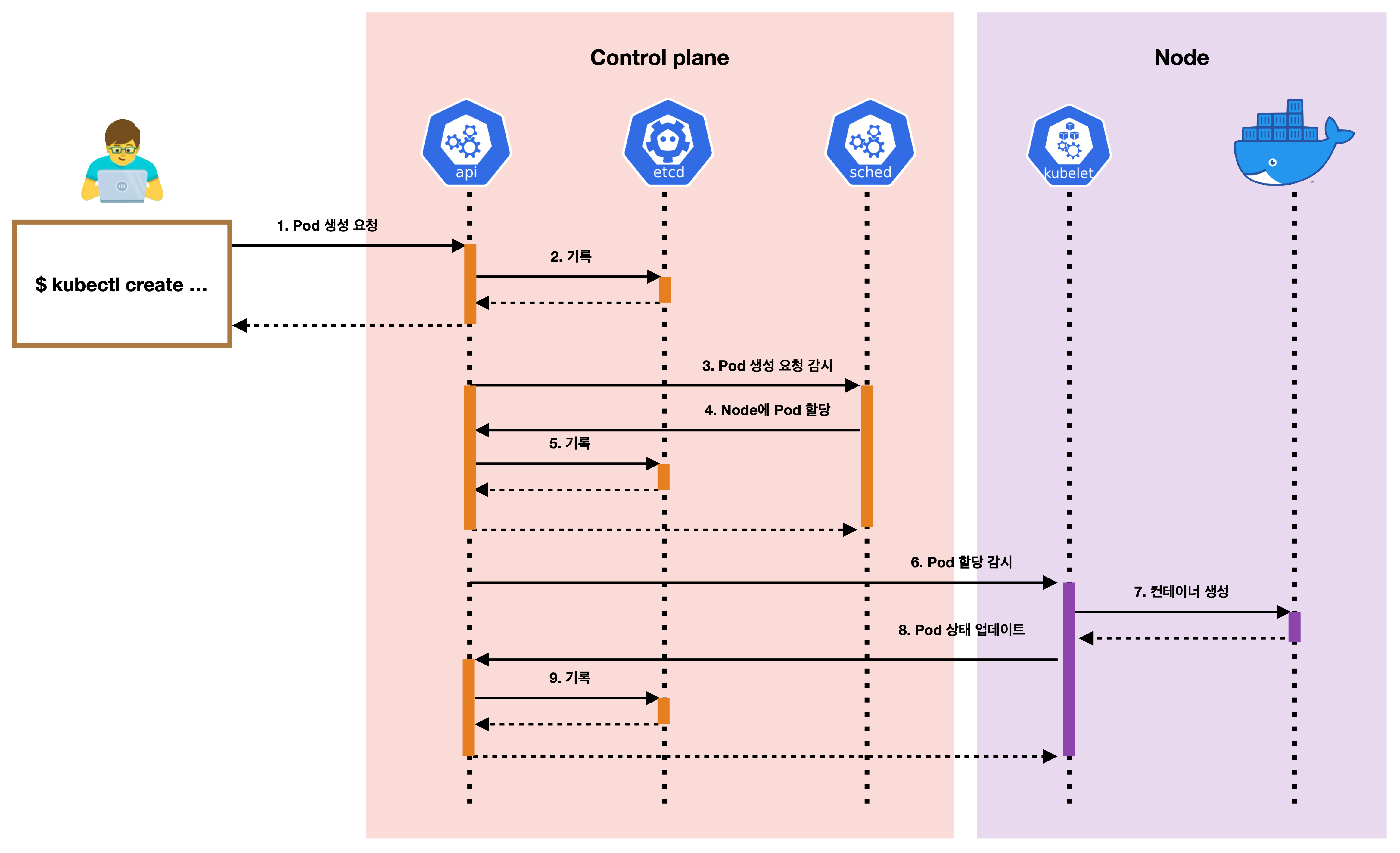 ㄴ API Server은 kublet에게 Pod 스팩 정보를 전달하고 생성요청을 한다.