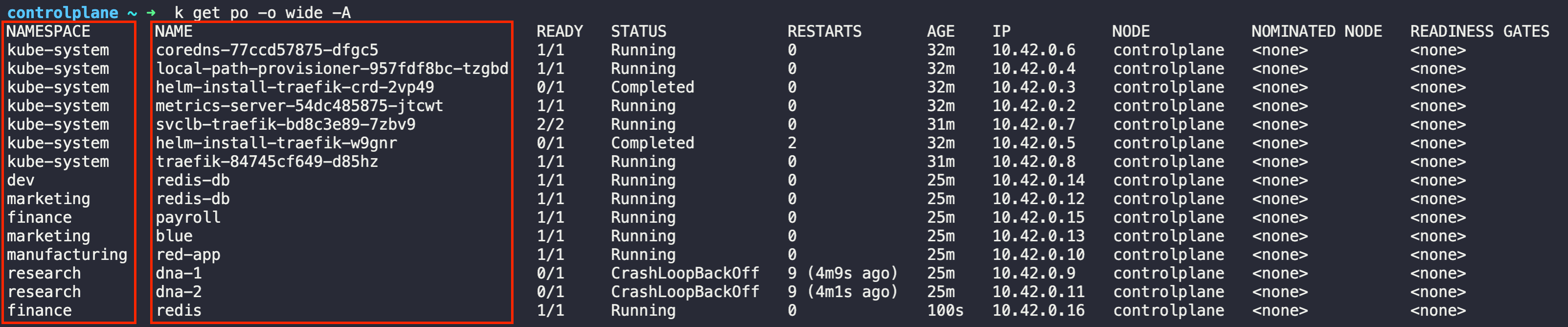 kube-system coredns-77ccd57875-dfgc5 1/1 Running 0 32m 10.42.0.6 controlplane <none> <none>