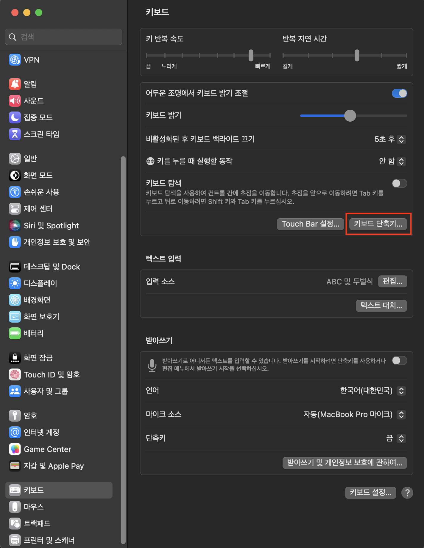 ㅇ 시스템 설정 > 키보드 > 키보드 단축키... 클릭
