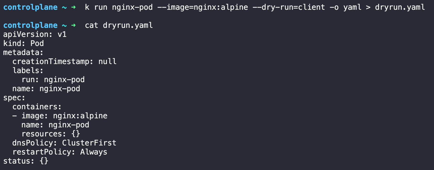 $ k run nginx-pod --image=nginx:alpine --dry-run=server -o yaml