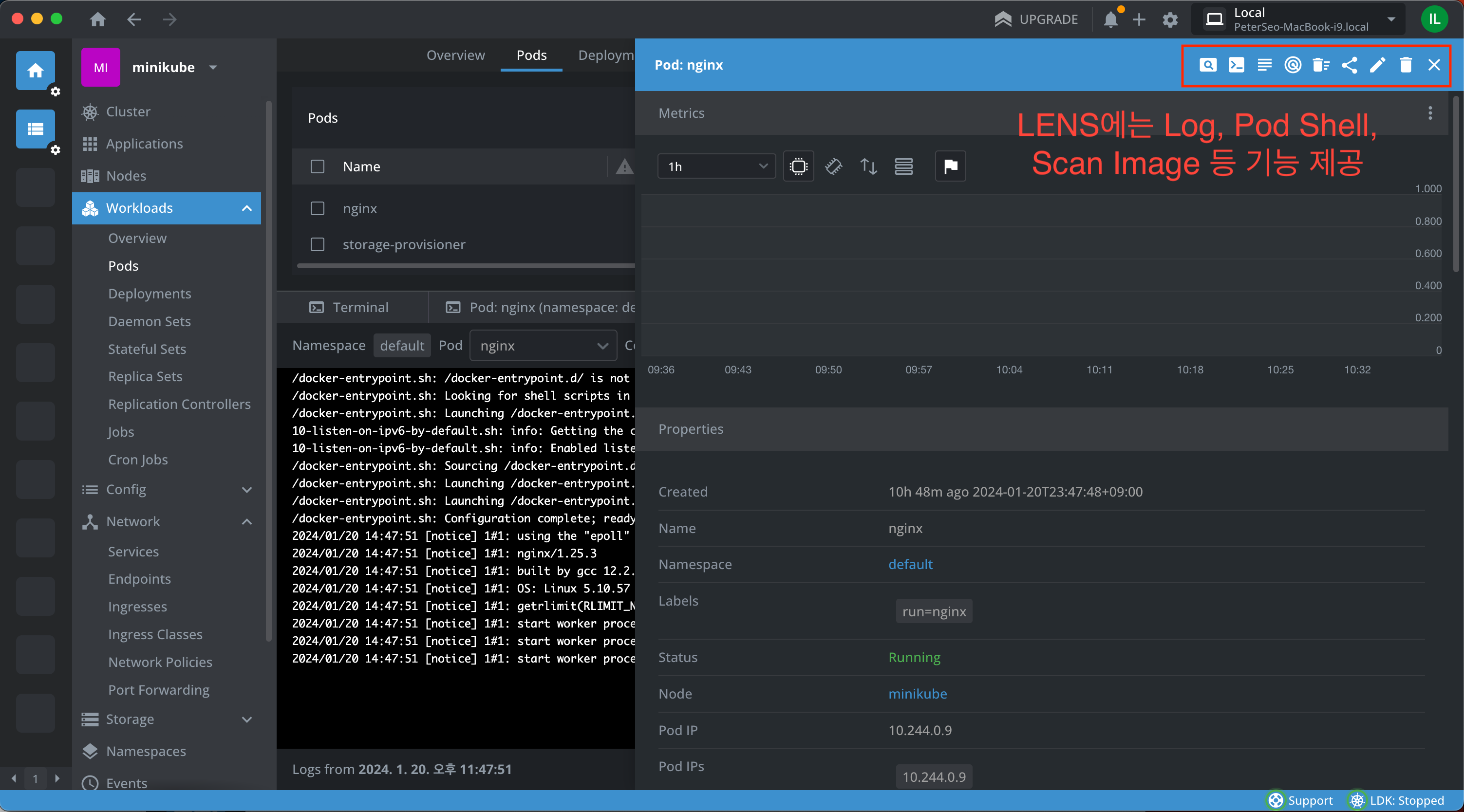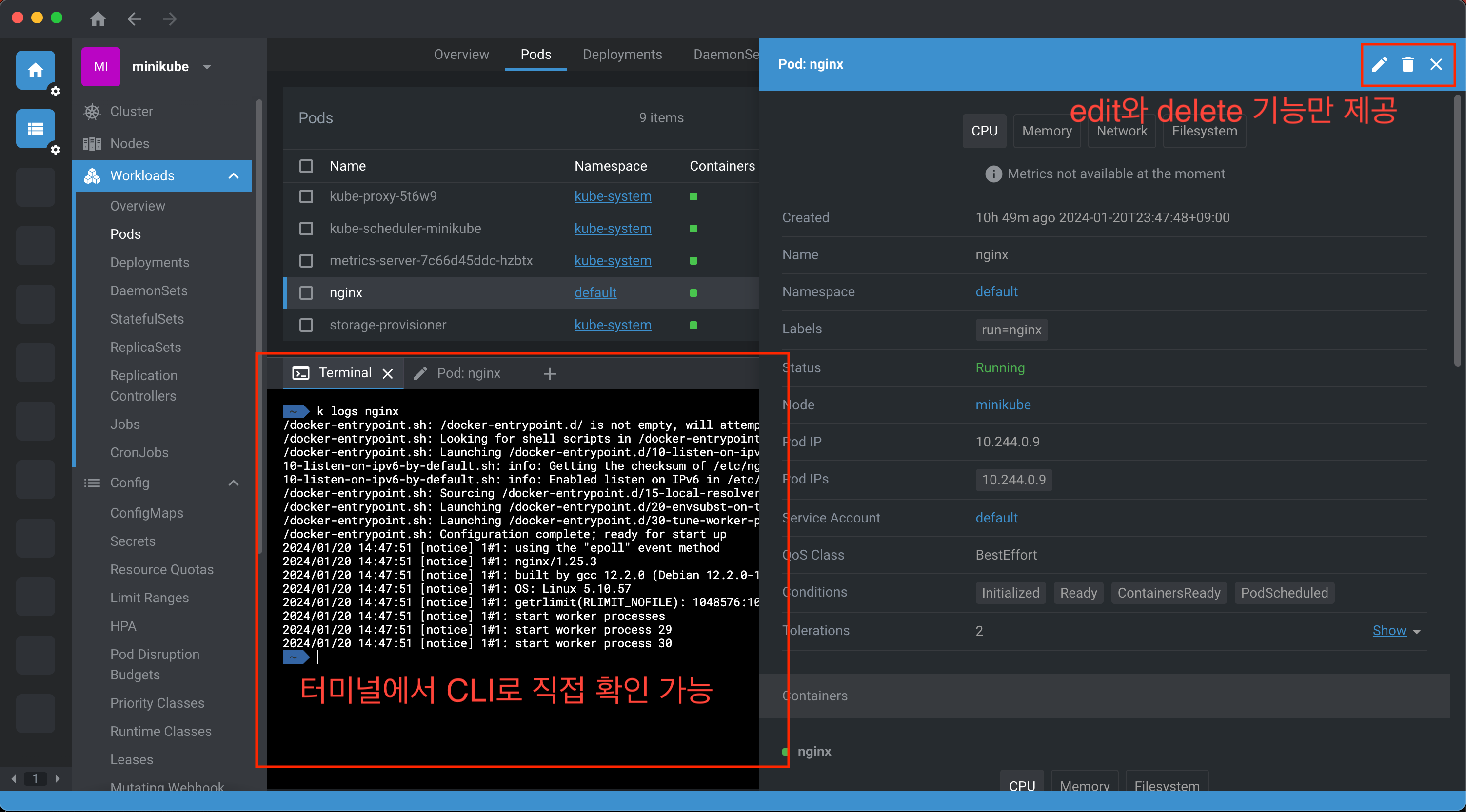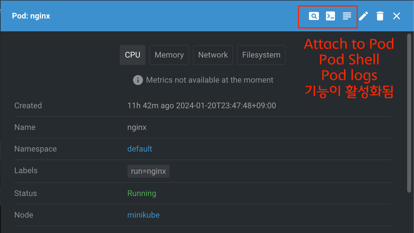 ㅇ Pod의 Attach to Pod, Pod shell, Pod logs 기능 활성화되었다.