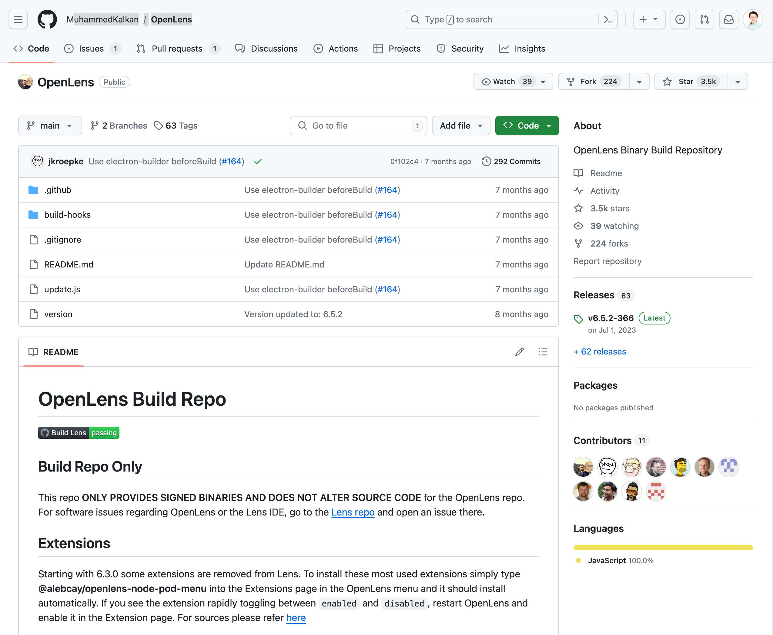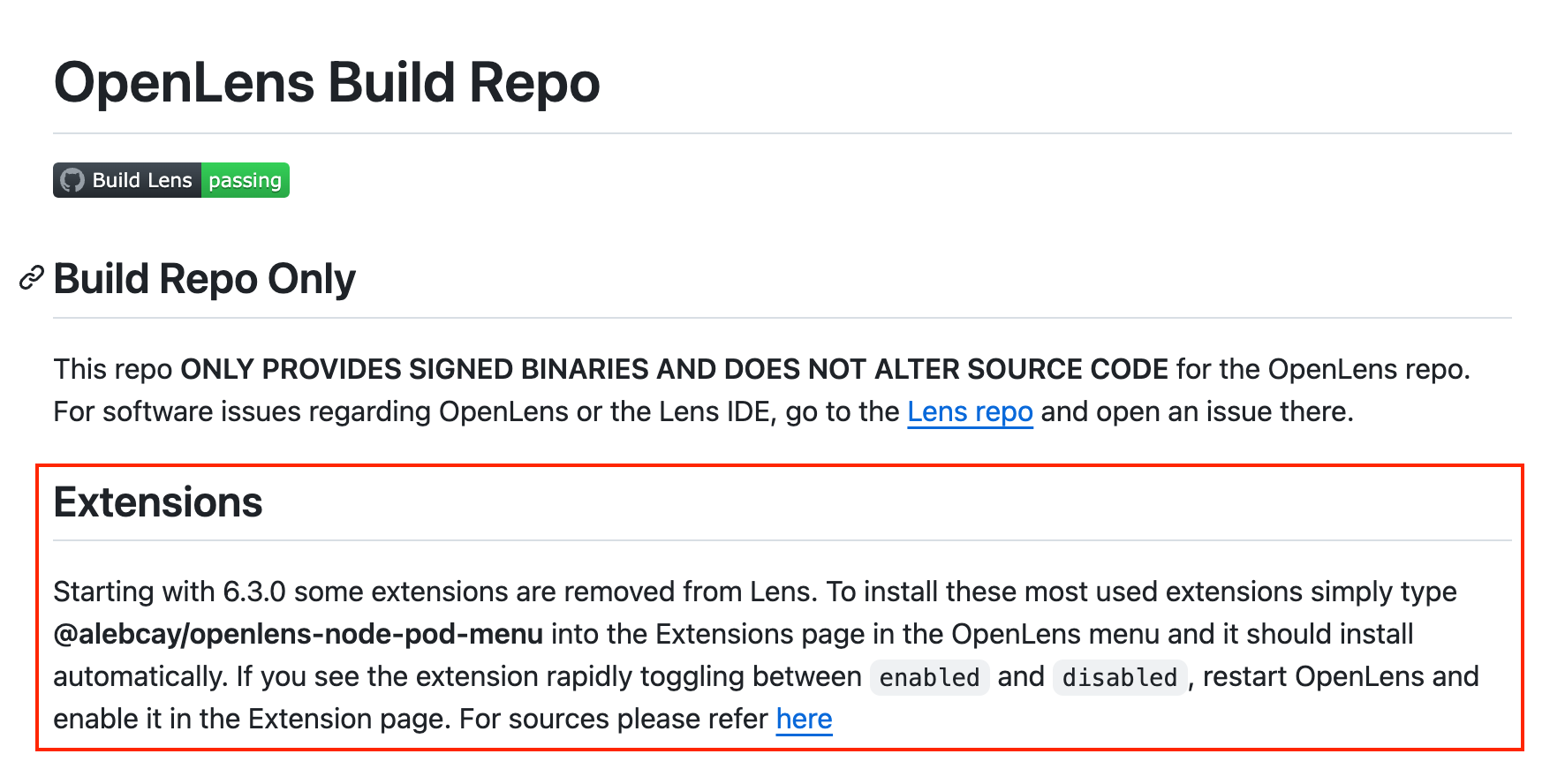 ㅇ Github에서 말하기를, 6.3.0부터 일부 확장 기능이 Lens에서 제거되었다.