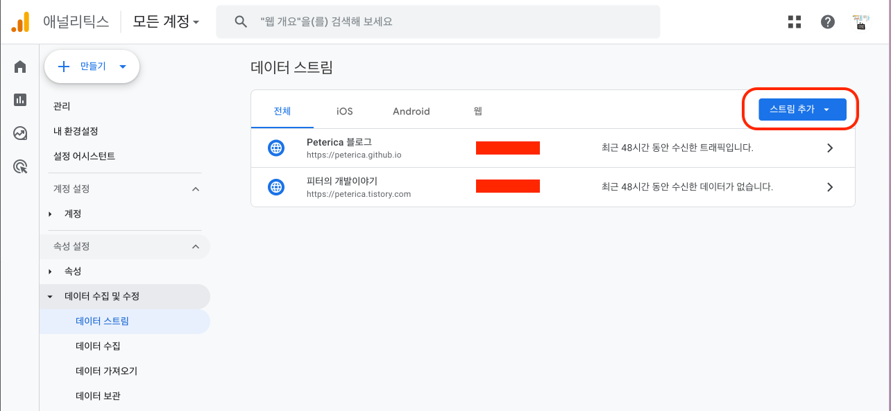ㅇ 데이터 수집 및 수정 > 테이터 스트림 > 스트림 추가