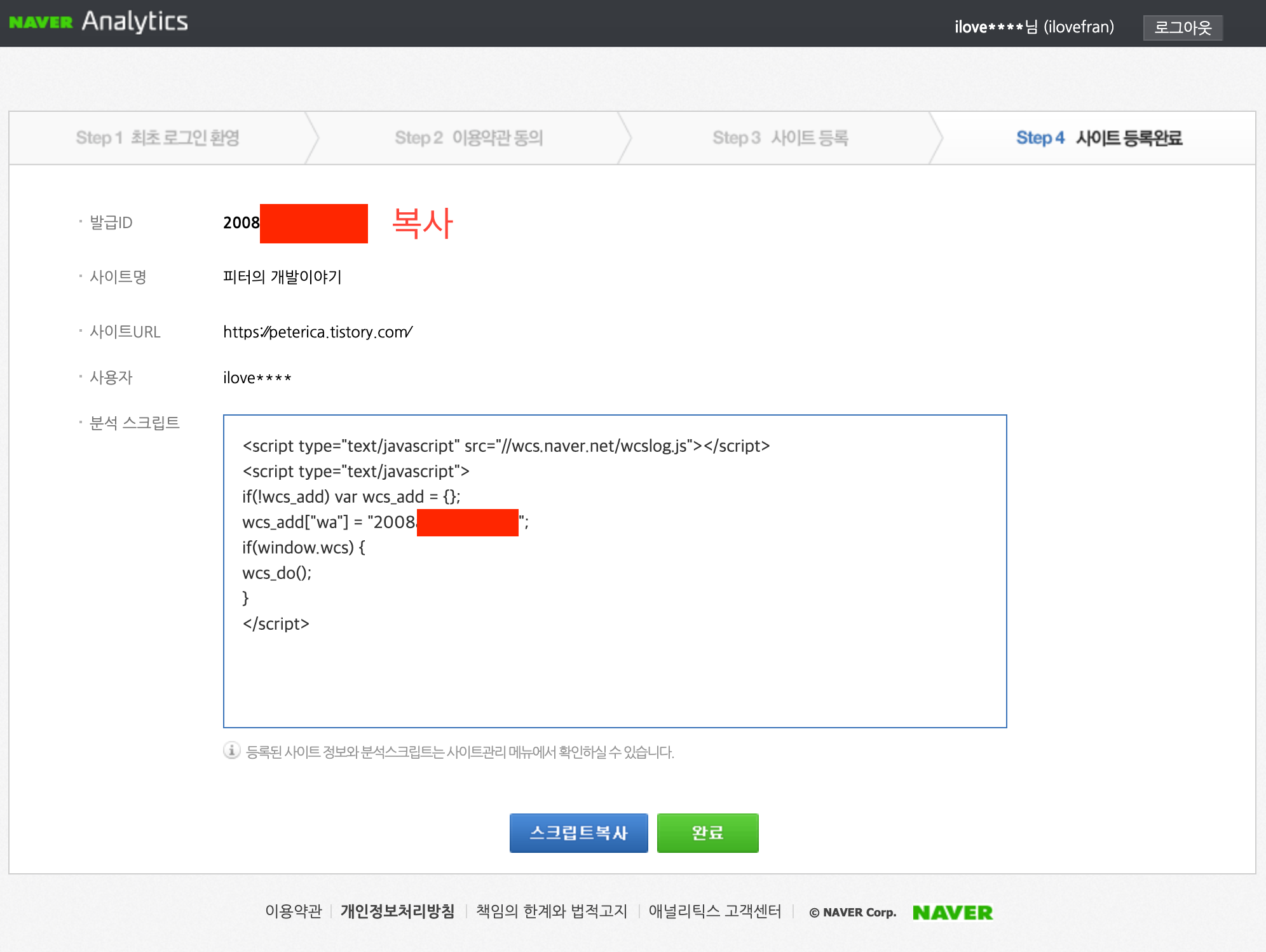 ㅇ 발급 ID 복사하여 티스토리 사이트 ID에 붙이고 적용