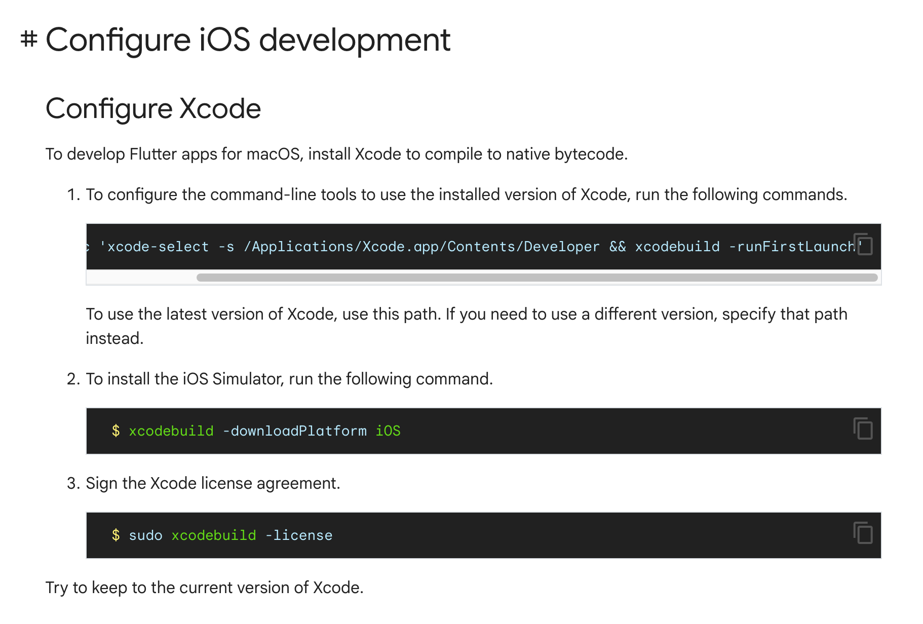 macOS용 Flutter 앱을 개발하려면 Xcode를 설치하여 네이티브 바이트코드로 컴파일하세요.