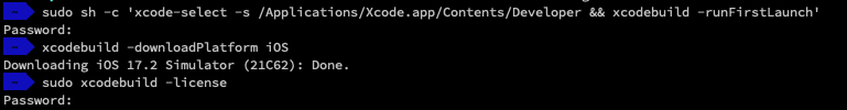 sudo sh -c 'xcode-select -s /Applications/Xcode.app/Contents/Developer && xcodebuild -runFirstLaunch'