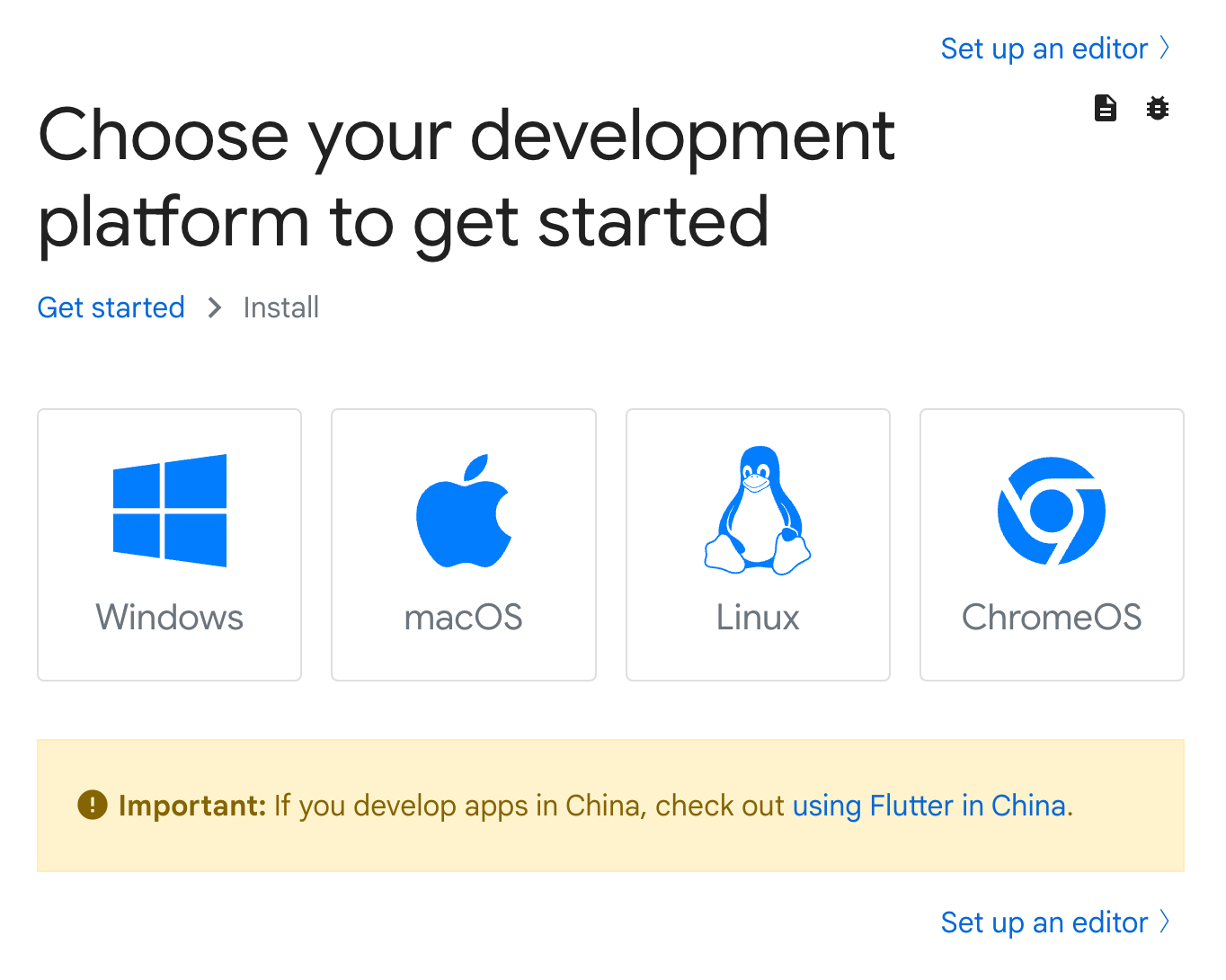 ㅇ 플러터 설치 공식 페이지로 이동하여 macOS를 선택한다.