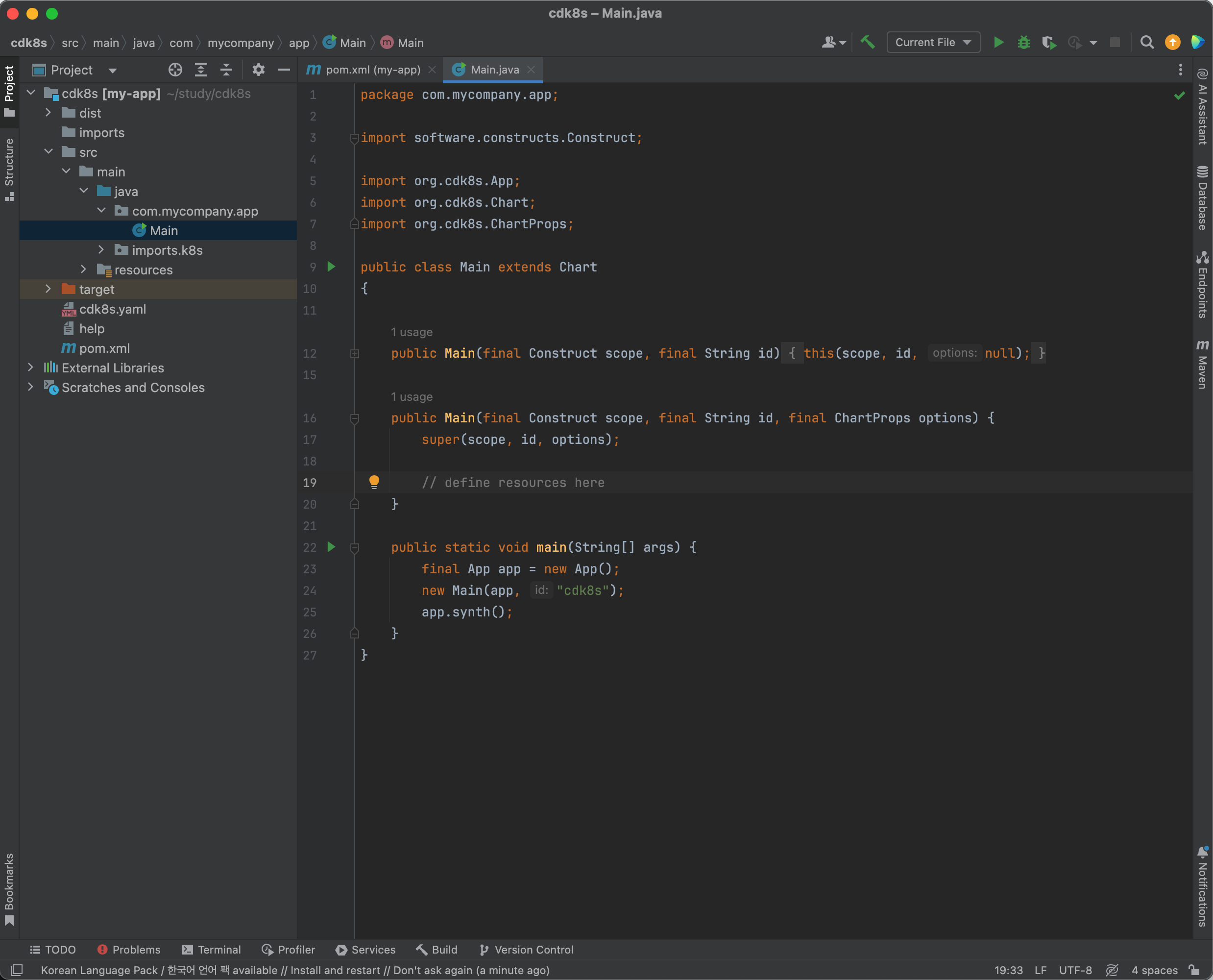 cdk8s를 소개하고 Java 라이브러리를 이용하여 샘플 yaml를 만들어 보았습니다. IDE와 함께 Java의 객체지향적인 언어의 장점을 활용하여, 빠르게 코드를 작성할 수 있었다. 더욱이 빌드과정에서 사전에 오류사항을 발견하고 수정할 수도 있고, yaml의 문법오류에 대해서 신경쓰지 않고 코드에 집중할 수 있었다. 개발자의 입장에서 cdk8s는 코드를 통해 안정적인 kubernetes 메니피스트를 작성하게 도와주어, kubernetes 클러스터를 관리를 도와주는 좋은 도구라고 생각한다.