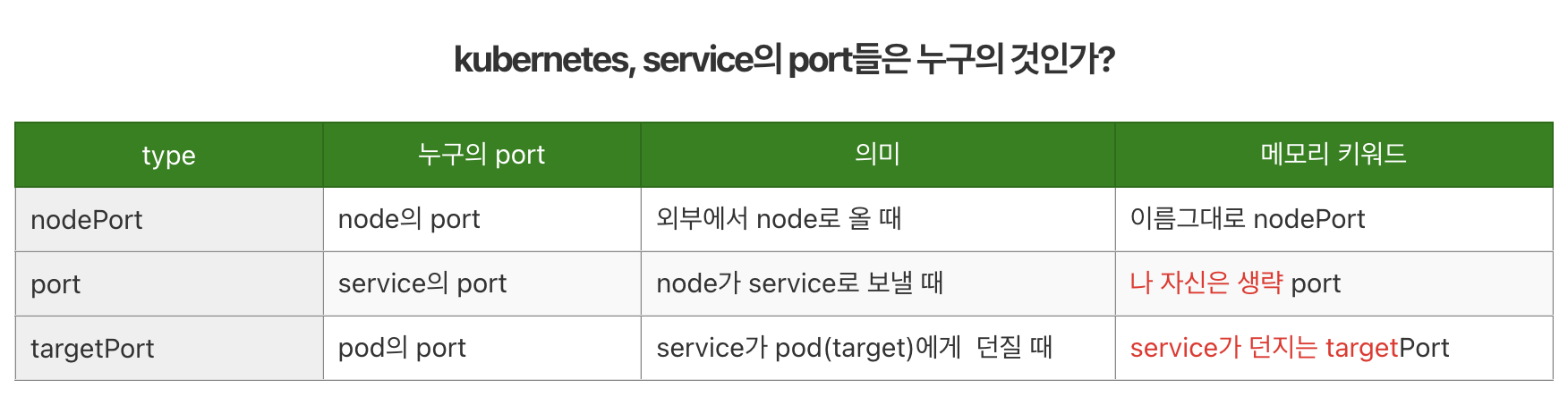 ㅇ CKA 공부하면서 Service의 port들이 자꾸 헷갈렸다. 누구의 port인가? 기억을 위해 표를 만들었다.