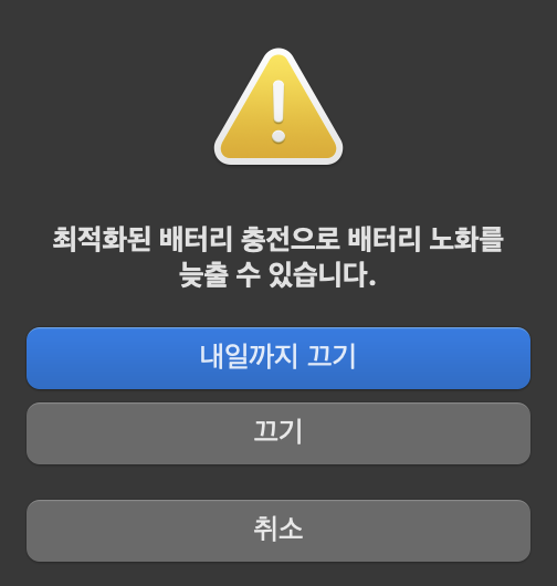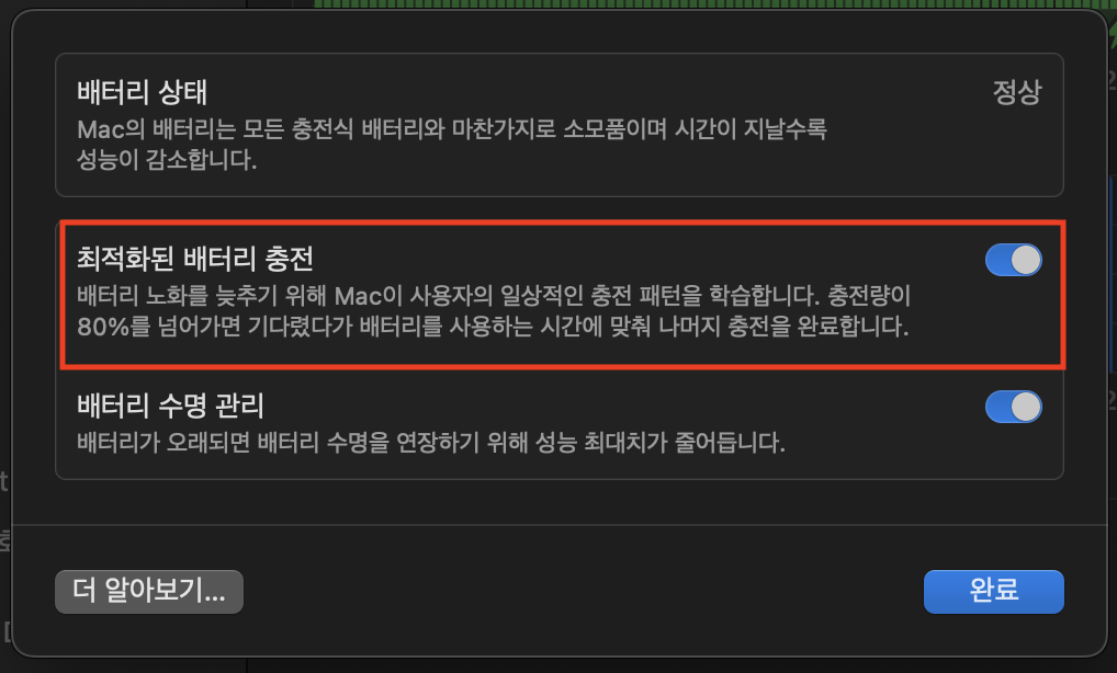 AlDente - Charge Limiter앱을 활성을 위해 기본 맥의 배터리 최적화 기능을 정지시켜야 한다.