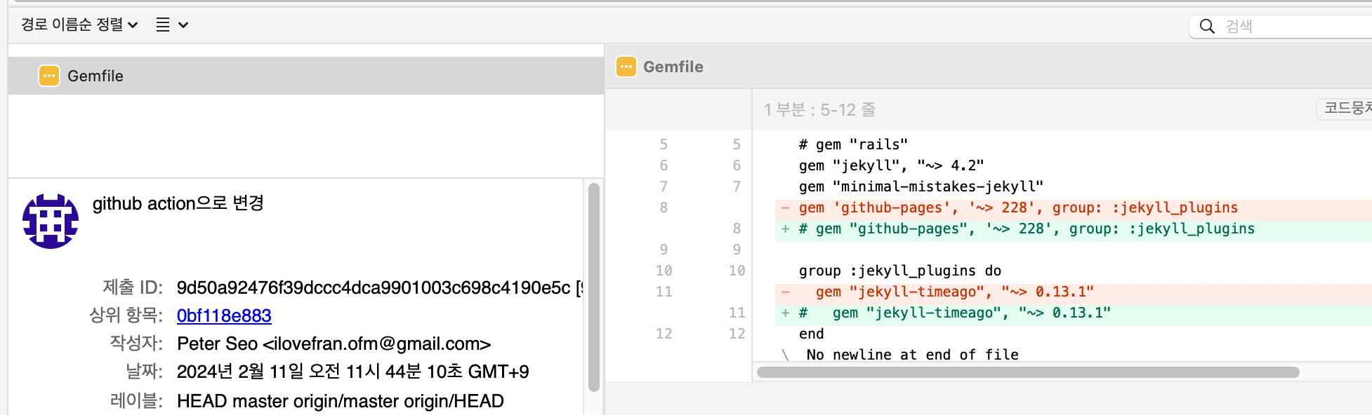 ㅇ 위의 해결시도- github-pages v228에 조치하였던 것이 문제가 되어서 원복하고 jekyll 버젼을 4.2로 설정하였다.