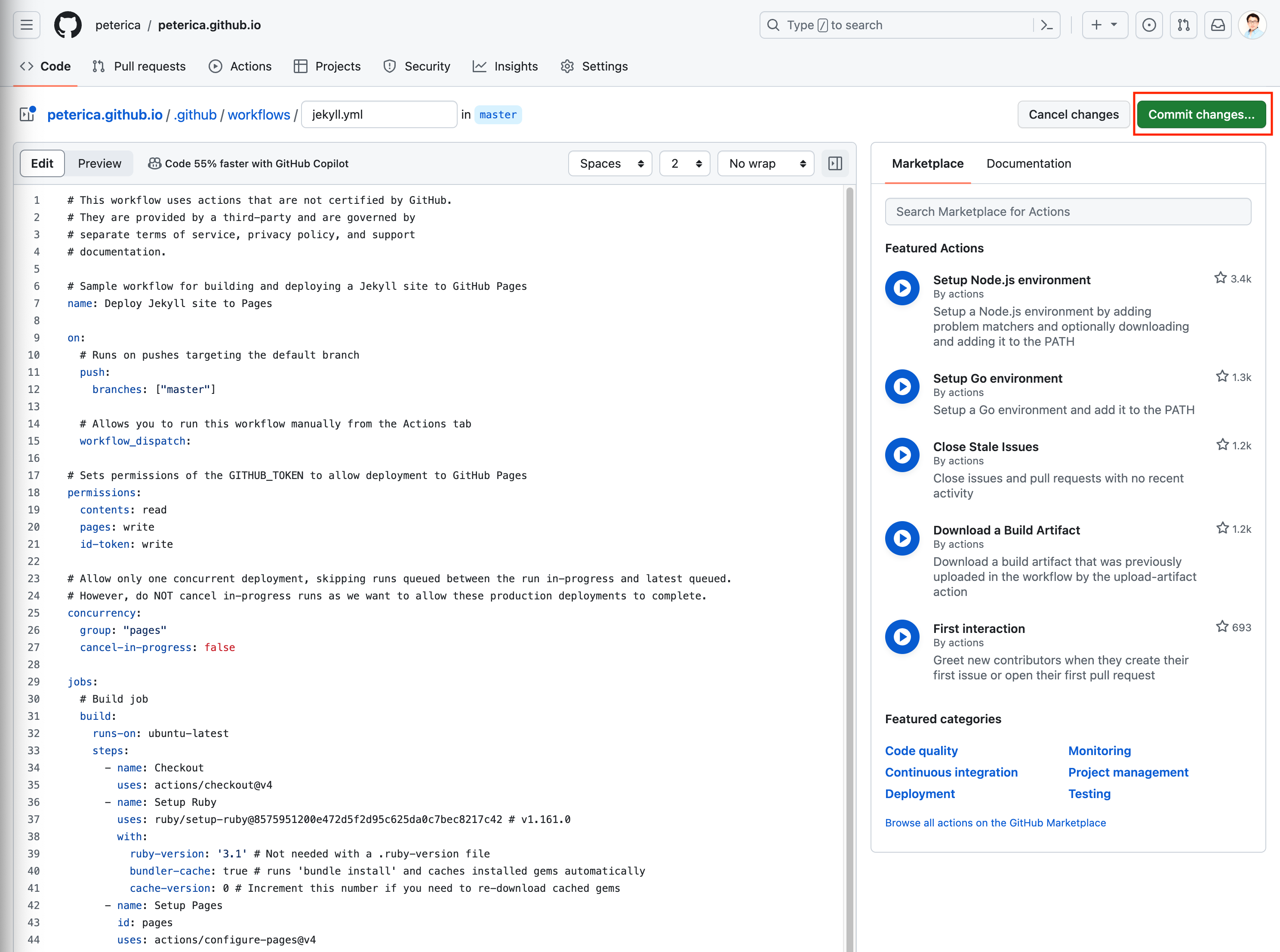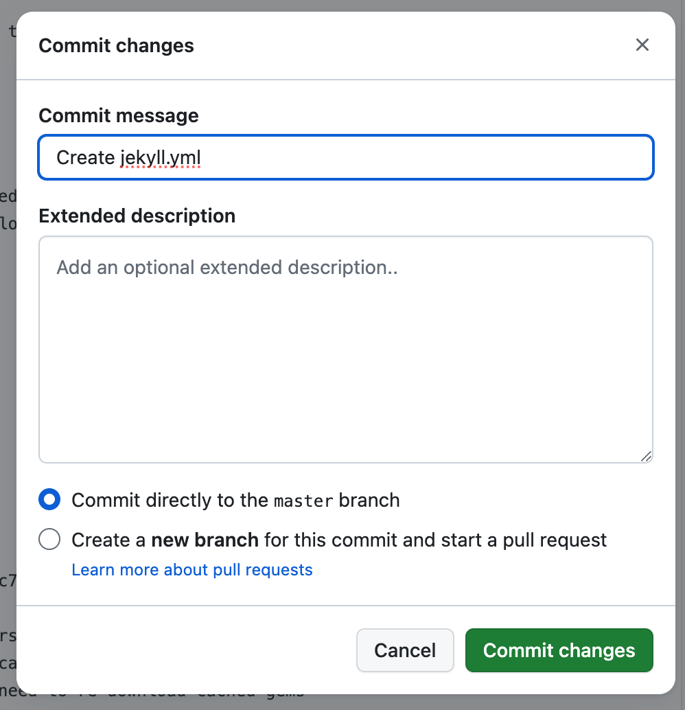 ㅇ 위의 jekyll.yml의 내용은 기본 제공되었다. 다른 수정사항 없이 Commit Chages를 클릭하였다.