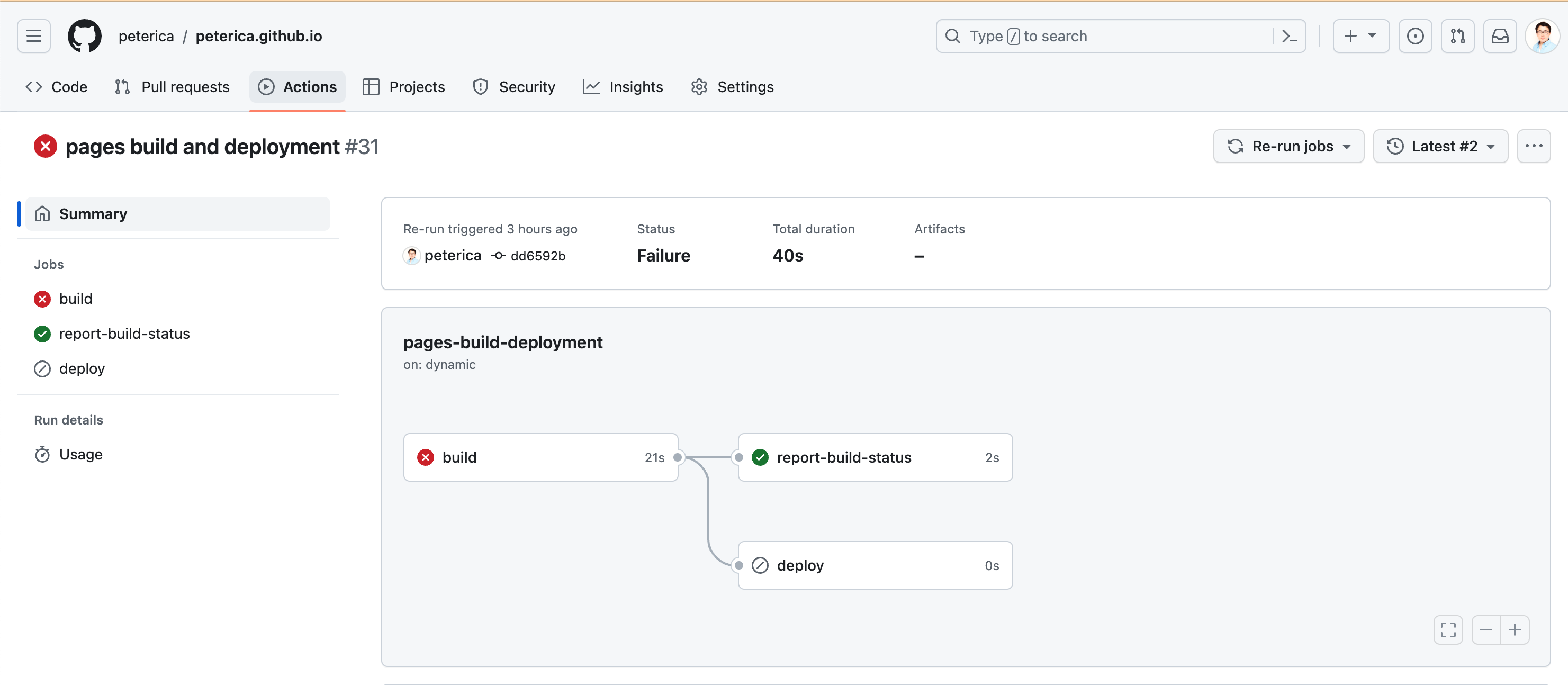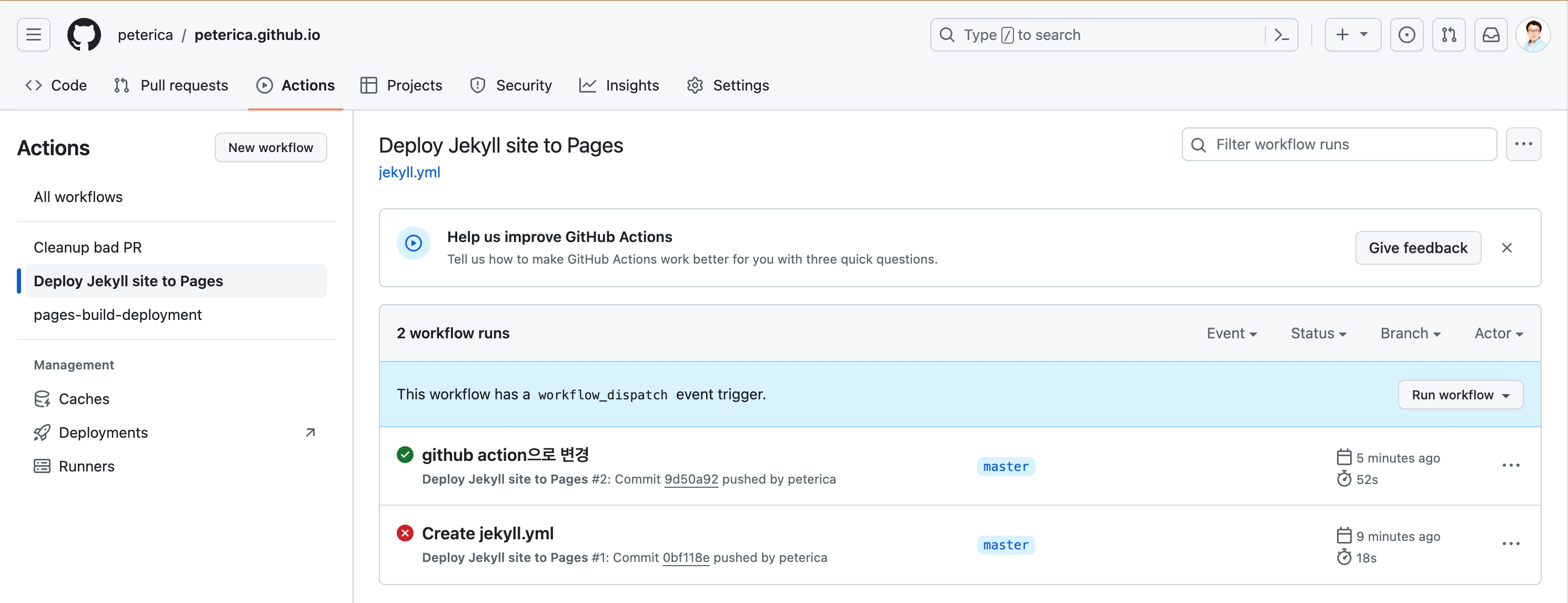 ㅇ 빌드 경고는 Github page에서 GitHub Actions로 변경하도록 권고하였다.