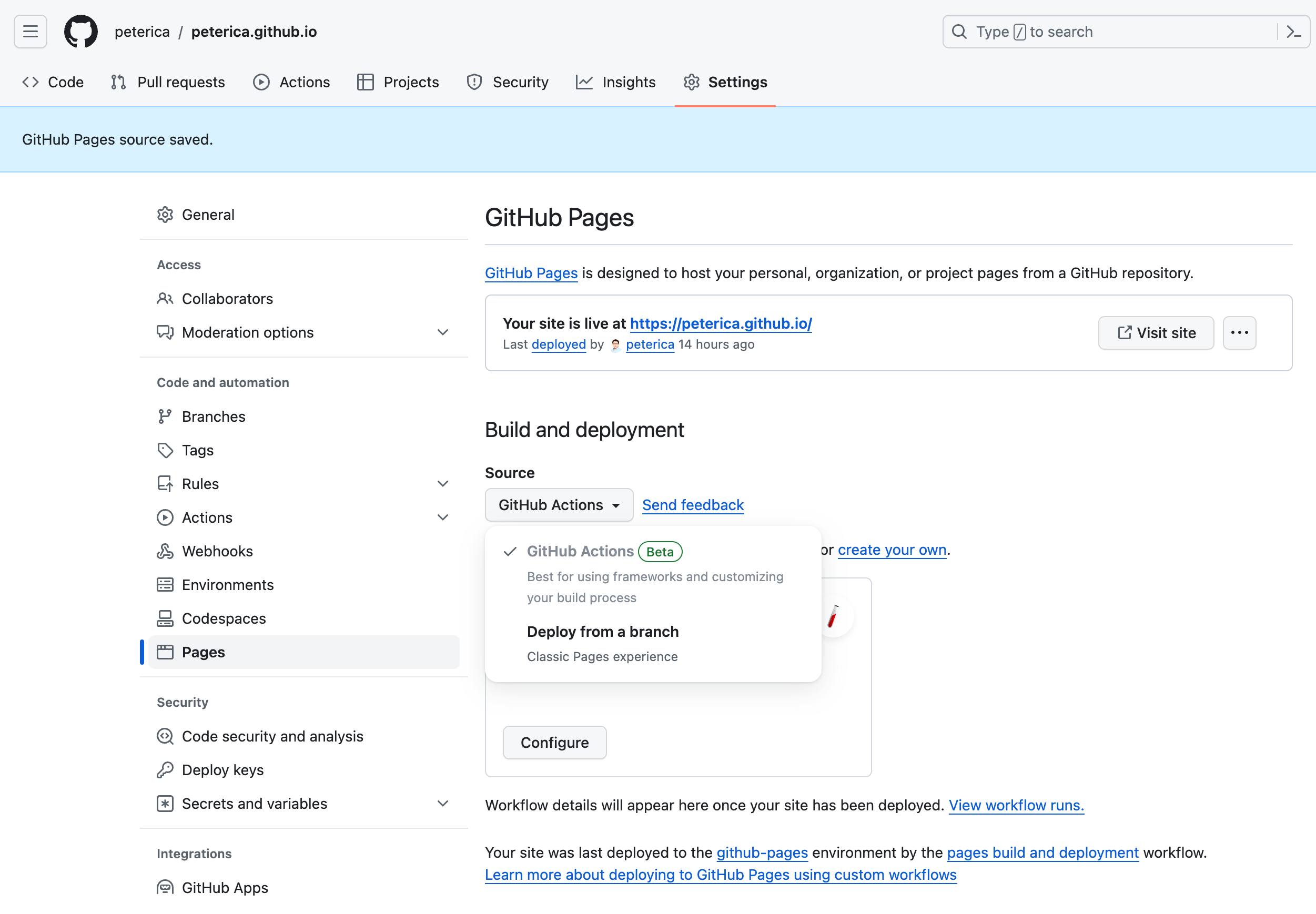 ㄴ Buid and deployment - Source에서 GitHub Actions를 선택한다.