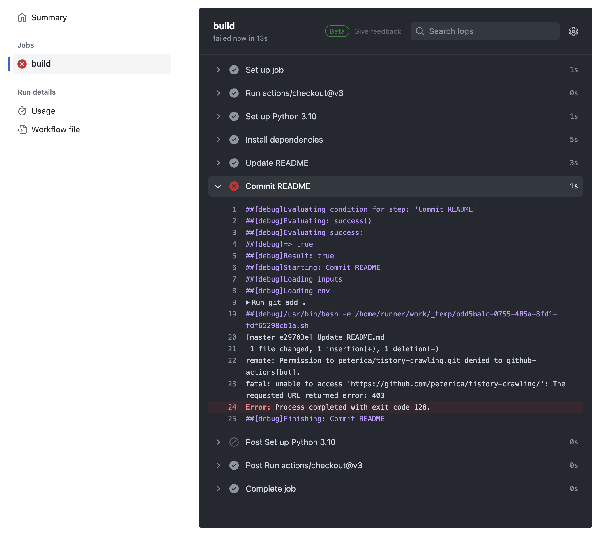 ㅇ job을 재시작 하였고, 문제가 되었던 Job: Commit README가 정상 작동하였다.