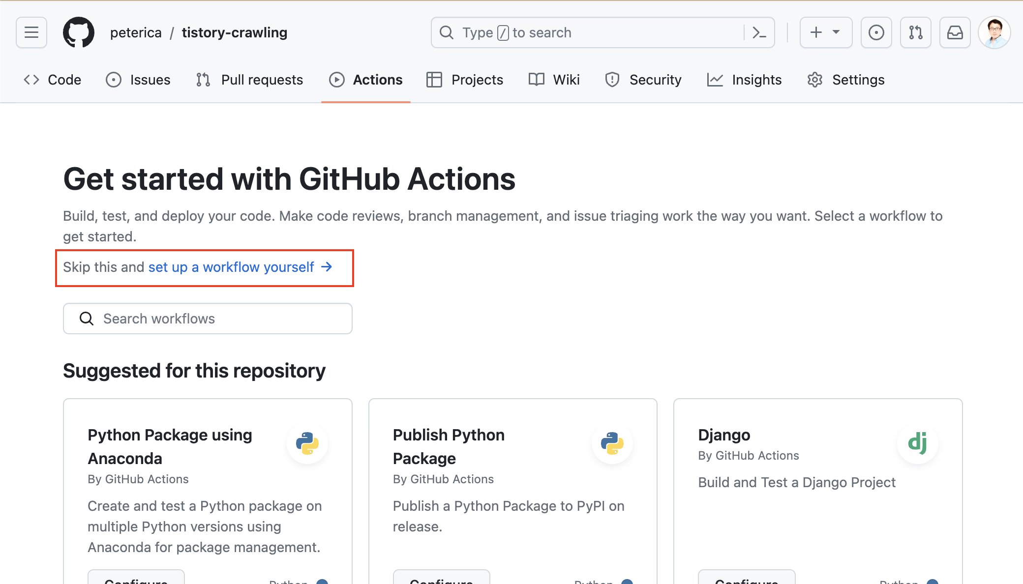 ㅇ Github의 Actions 탭으로 이동한다.