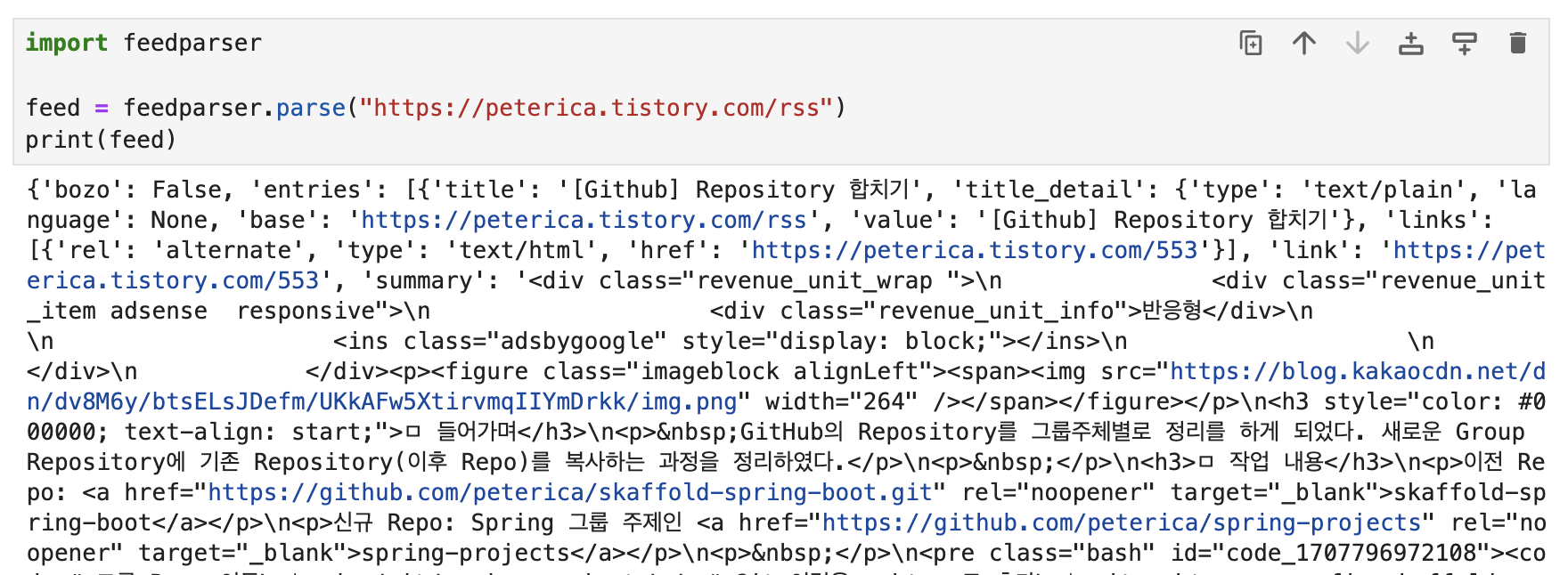 feed = feedparser.parse("https://peterica.tistory.com/rss")