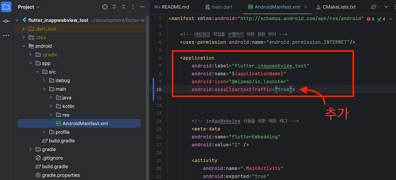 [flutter] 안드로이드 웹뷰 URL 호출 에러 ERR_CLEARTEXT_NOT_PERMITTED