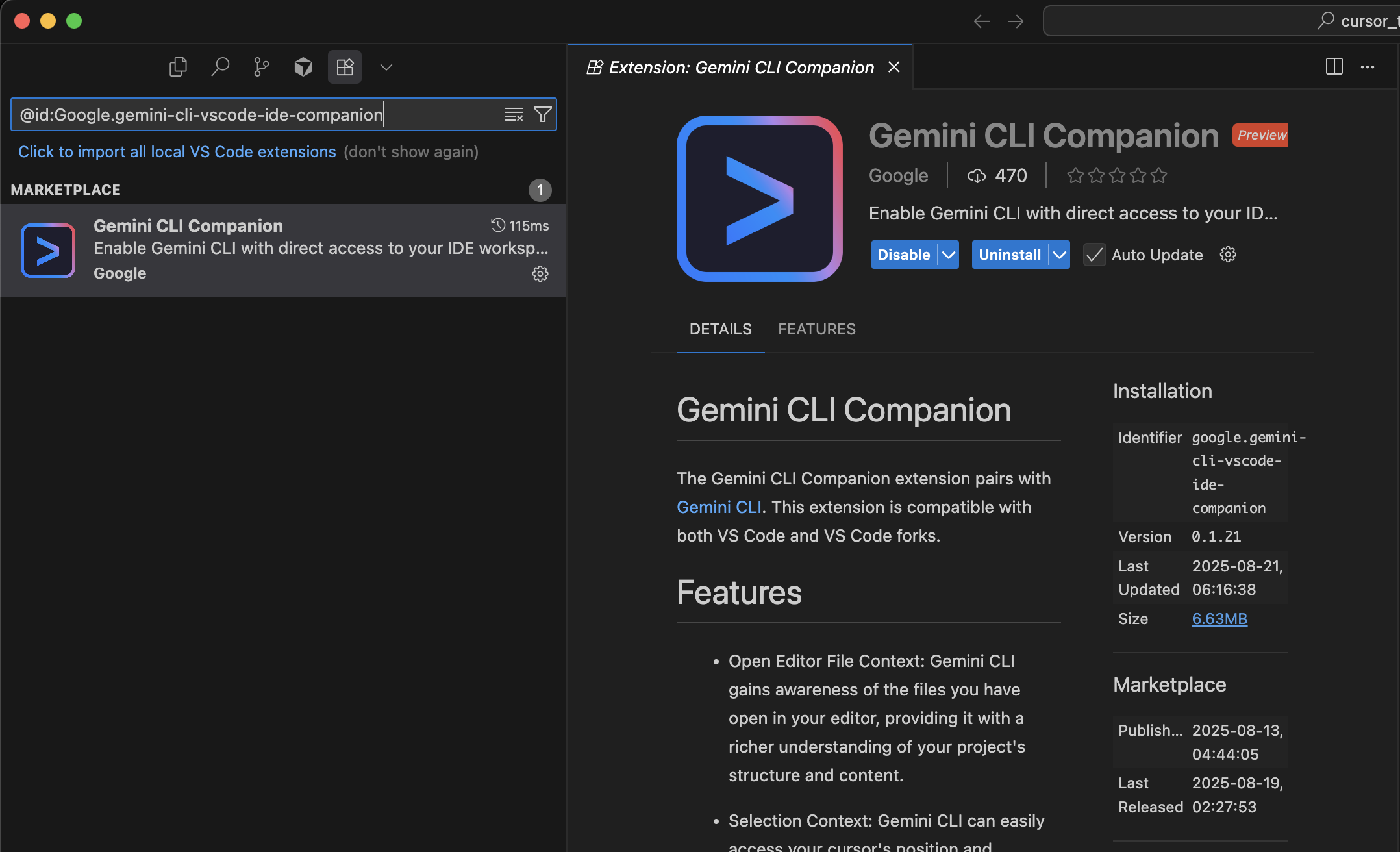 ㅇ Gemini CLI Companion 확장(커서/VSCode) 설치