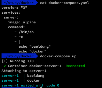 command: sh -c "echo 'baeldung' && echo 'docker'"