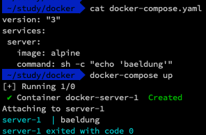 ㅇ docker-compose.yml 파일에서는 alpine Docker 이미지에서 단일 echo 명령을 실행하고 있다 .