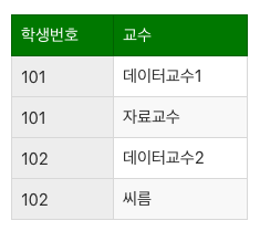 ㅇ 위 테이블에서 기본키는 학생번호와 강좌이다. 하지만 데이터베이스는 교수가 둘이다.