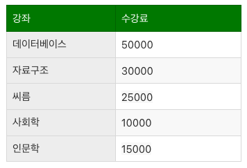 ㅇ 이 표에서 학생번호 → 강좌 → 수강료