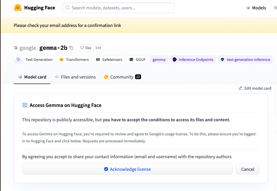 ㄴ google/gemma-2b로 이동하여 라이센스 승인을 받습니다.