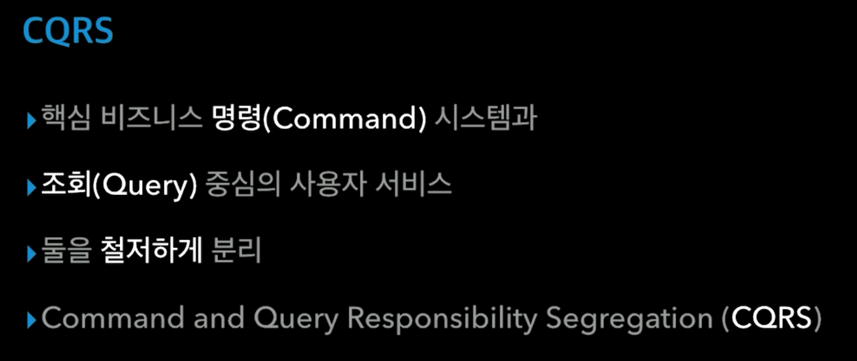 - 명령(Command): 핵심 비즈니스 영역, Creat, Update, Delete