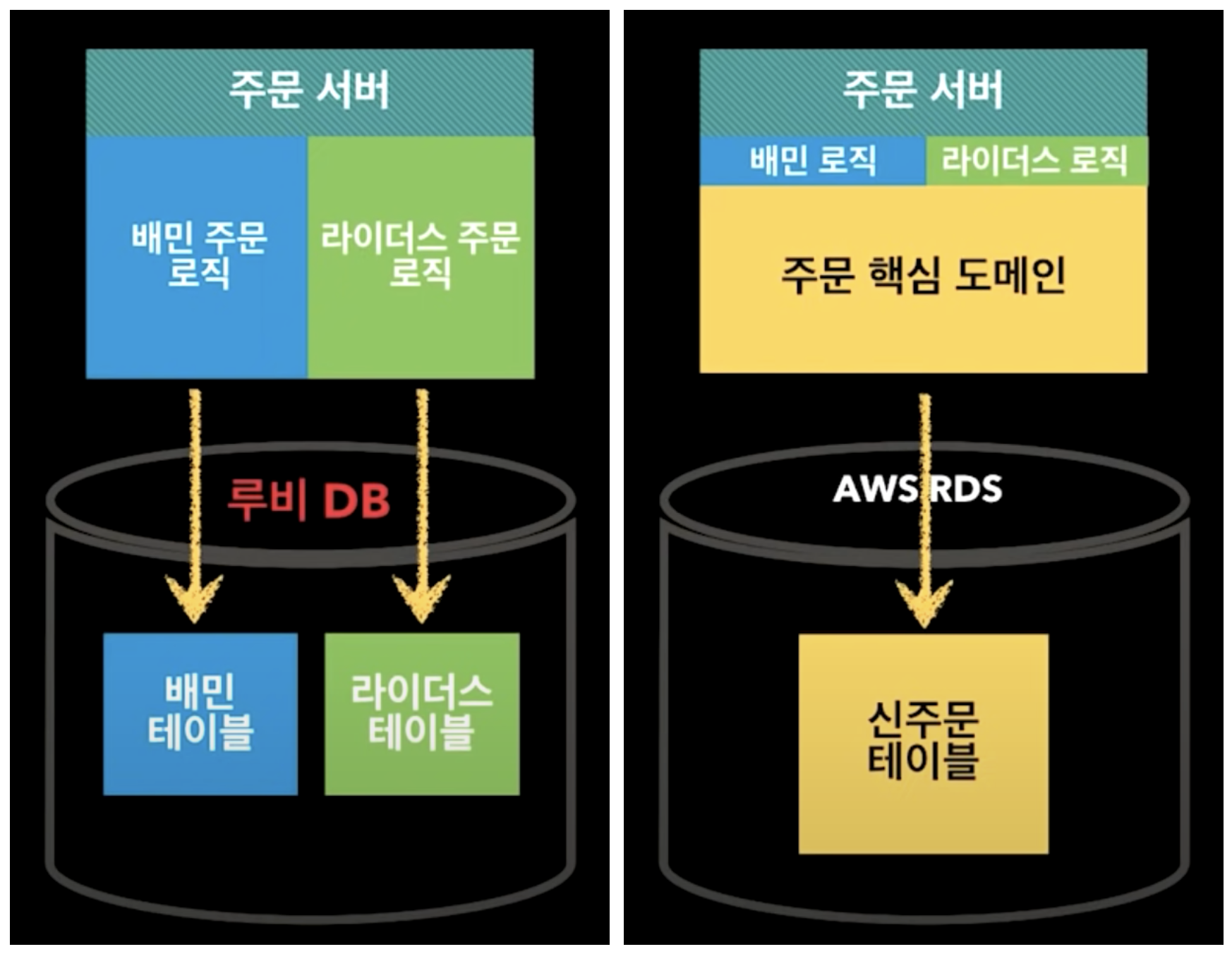 ㅇ 기존 서비스는 모노리틱 아키텍처로 디비를 중심으로 여러 Application이 "통짜"로 구축되어 있었다.