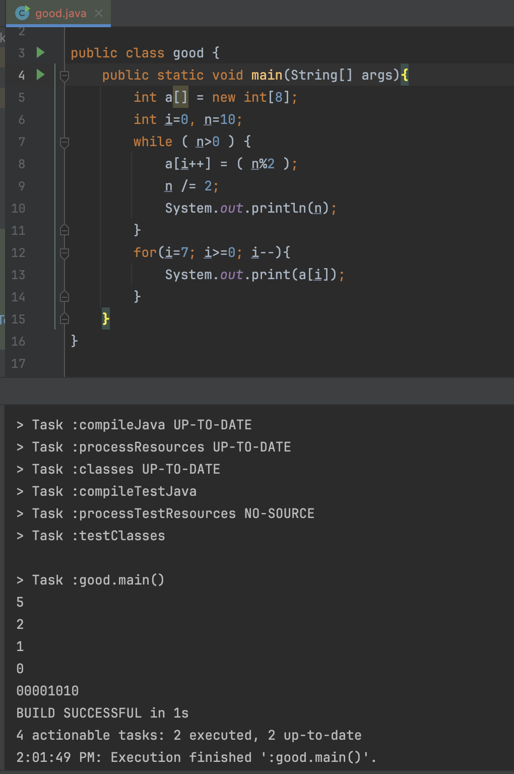 18. 아래의 <처리결과>처럼 10진수를 2진수로 변환해주는 프로그램이다. 빈칸의 JAVA 구문을 쓰시오.