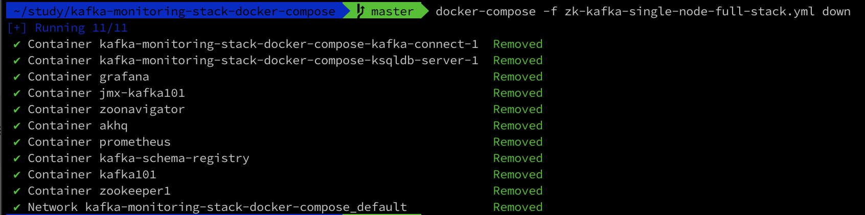$ docker-compose -f zk-kafka-single-node-full-stack.yml down